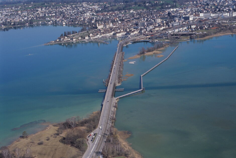 Diese Fundstelle, keine Siedlungsstelle, sondern ein Verkehrsweg, liegt in der untiefen Seeenge zwischen Freienbach Hurden (SZ) und Rapperswil (SG). Belegt sind Pfähle und Konstruktionshölzer verschiedener Brücken und Stege, welche mittels Dendrochronologie und C14- Analysen datiert sind. Es wurden Strukturen aus der Horgener Zeit, Früh- (1620-1495 v.Chr.), Mittel- und Spätbronzezeit, aber auch der Hallstattzeit (135 v.Chr.), Römischen Epoche (165 n.Chr.) und dem Mittelalter (741 n.Chr.) gefunden.