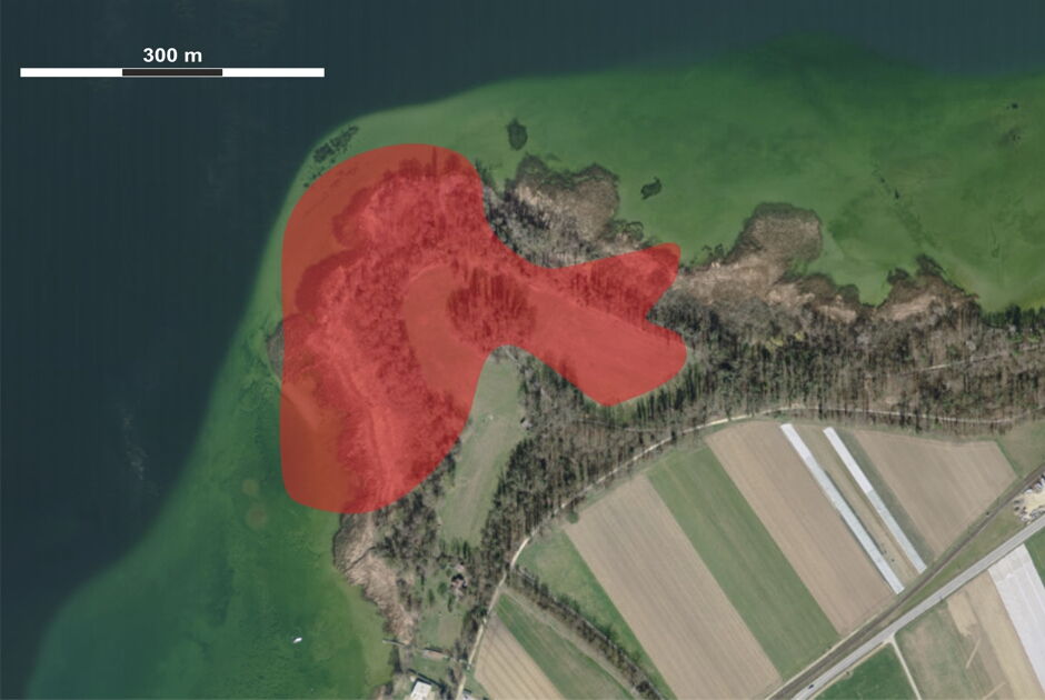 To the south-west of the site, submerged under two metres of water, are two circular mounds of pebbles and the piles of a fourth lake dwelling site, previously unknown. The function of the pebble circles, which are likely related to the nearby pile dwelling sites, is still unknown, but a parallel could be drawn with a series of more than a hundred circular pebble deposits recently discovered under the waters of the canton of Thurgau, on the south-western shore of Lake Constance, which may have been used for ritual purposes.