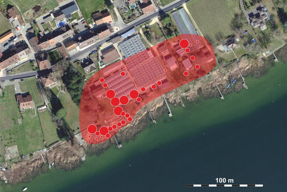The station is mainly preserved on dry land. To the south, on the lake side, the remains have been completely eroded away at the current shoreline. The northern boundary is difficult to define due to the embankments deposited along the former shoreline. Core samples taken in the 2000s revealed an anthropogenic layer in very good condition, more than 70 cm thick in places. Its extent has been recognised over an area of more than one hectare. The archaeological layer is deep and well preserved. This pile-dwelling settlement provides a wealth of essential information about the northern shore of Lake Murten, where pile-dwelling sites are still poorly understood.