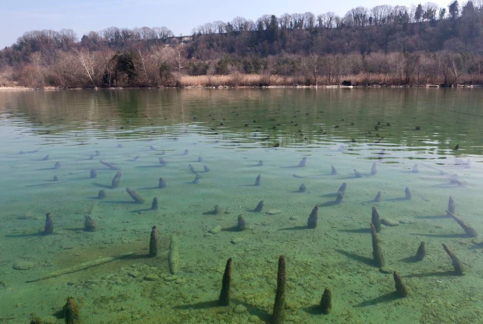 Pointe de Montbec extends to about 1.8 hectars and represents one of the largest prehistoric sites at the Neuenburgersee. The settlement remains are submerged in 1-3 meters of water, and one can easily recognize their architectural layout, with a system of rectangular Palisades for protection. In the assembled map, we can recognize three-sectioned buildings that stand perpendicular to the shore, and we can identify at least two construction phases. The site is located in an undeveloped area of the lake, but the erosion of the shoreline is considerable, and needs to be monitored. Northeasterly of the village, four log boats were recovered.