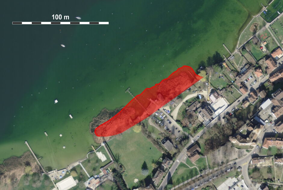 Ein Pfahlfeld und eine flache archäologische Schicht markieren die Grenzen dieser Siedlung, die in Ufernähe in geringer Wassertiefe erhalten geblieben ist und daher von Erosion bedroht ist. Dendrochronologische Datierungen belegen eine erste Besiedlung gegen Ende der mittleren Jungsteinzeit (späte Cortaillod-Kultur, mit Holzfällungsphasen zwischen 3572 und 3552 v. Chr.). Eine zweite Besiedlungsphase stammt aus der späten Jungsteinzeit (Auvernier-Cordé-Kultur, um 2539 v. Chr.). Die erste Oberflächenprospektion lieferte Fundstücke aus der späten Jungsteinzeit, aber Ausgrabungen im Jahr 2010 brachten sehr vielfältiges archäologisches Material (Keramik, Steinwerkzeuge, Holzarbeiten, Tierfragmente usw.) zutage, das der mittleren Jungsteinzeit zugeordnet wird. Möglicherweise erstreckt sich die Fundstelle bis zum Ufer, in das Schilfgebiet und unter moderne Aufschüttungen.